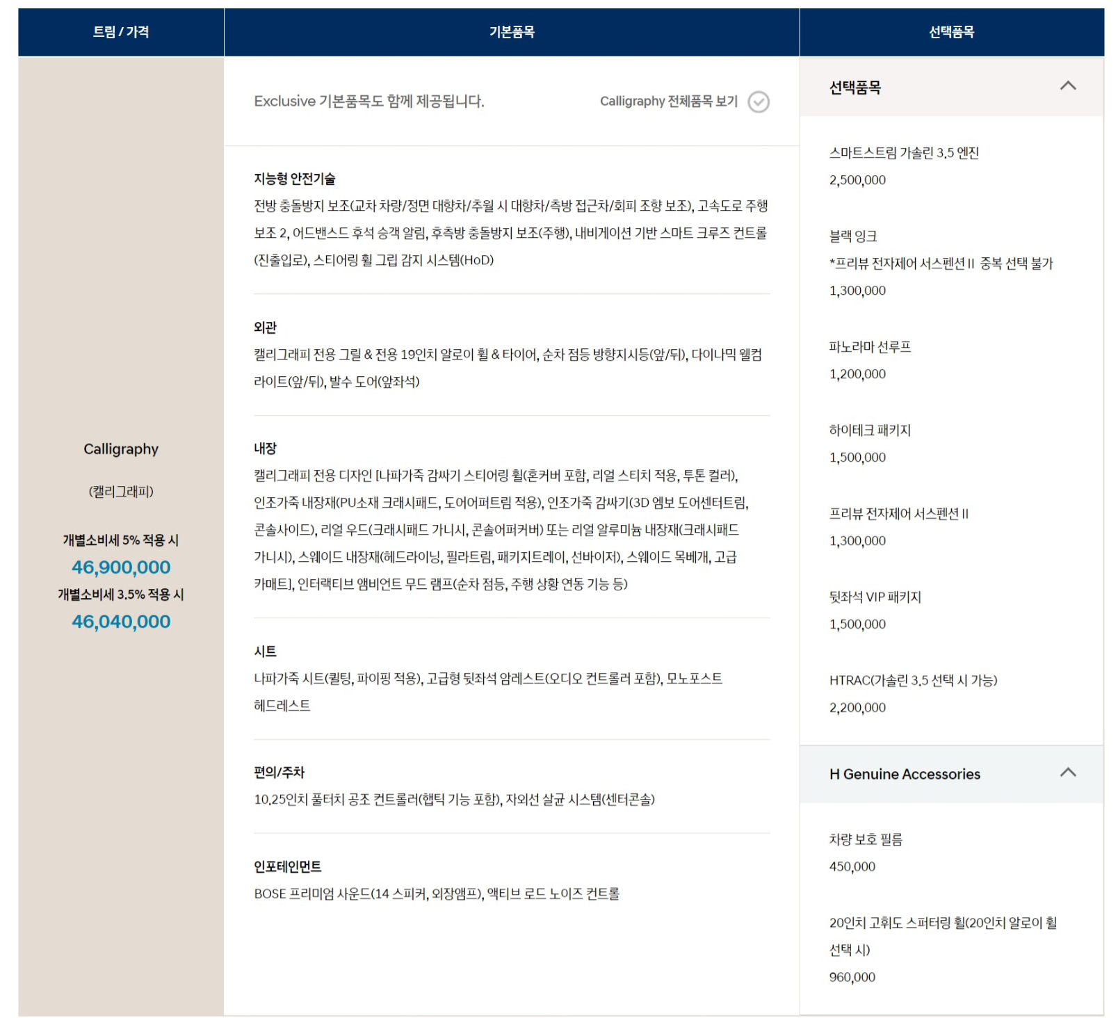 그랜저 캘리그래피 가격표