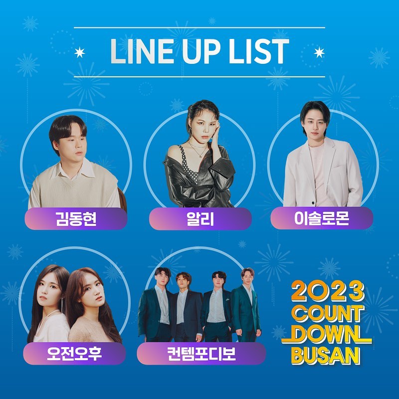 부산 광안리 해수욕장 카운트다운 해돋이 무대에는 가수 알리와 김동현, 이솔로몬, 여성듀오 '오전:오후', 컨템포디보가 출연합니다.
