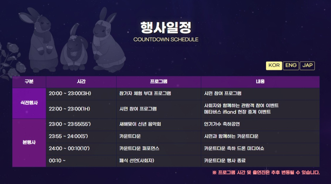 | 22:00 ~ 23:00(1시간) | 시민 참여 프로그램 | 사회자와 함께하는 관람객 참여 이벤트 메타버스 ifland 현장 중계 이벤트 |