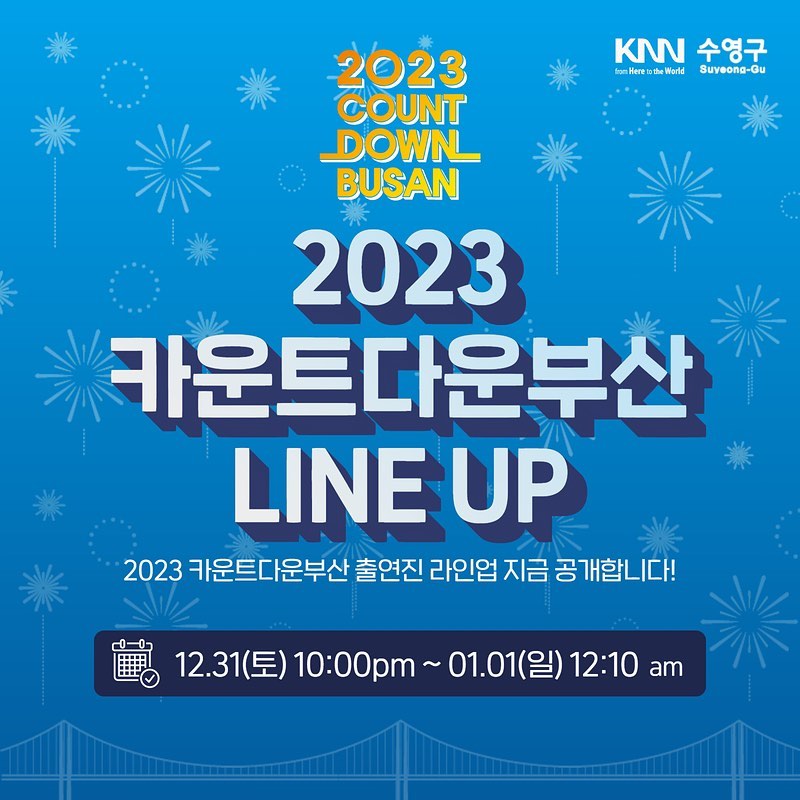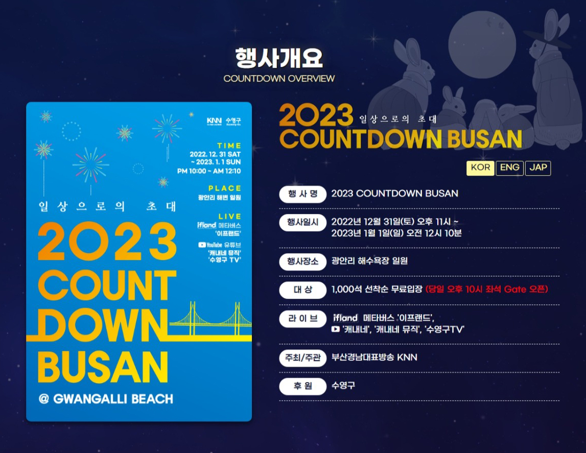 새로운 한해를 시작하는 미래를 향한 도약과 힘찬 응원의 메시지를 전하는 카운트다운 부산은 수영구 광안리 해수욕장을 배경으로 유튜브 캐내네 뮤직, 수영구 TV, 메타버스 이프랜드 내 부산랜드 카운트다운에서 스트리밍 서비스됩니다.