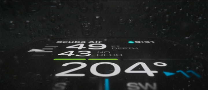 마음대로 설정할 수 있는 동작 버튼, 한 번 눌러 달리기 구간을 마킹하거나 탈출 경로를 찾거나 다이빙 컴퓨터를 구동할 수 있다. 다이빙 중 수심부터 수온까지 모든 걸 측정한다.