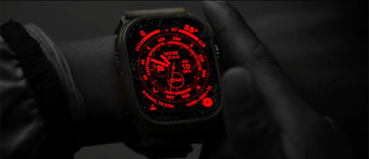역대 가장 크고 밝은 Apple Watch 디스플레이. 최대 2000 니트 밝기를 자랑하는 상시표시형 Retina 디스플레이는 그 어떤 Apple Watch보다도 2배나 더 밝습니다. 게다가 디스플레이가 더 커져서 상세한 운동 수치와 디테일을 가득 담은 시계 페이스를 보여줄 공간도 더 넓어졌습니다. ‘길잡이’ 페이스에서 Digital Crown을 돌려 ‘야간 모드’를 활성화하면 저조도 환경에서도 선명하고 편하게 볼 수 있습니다.