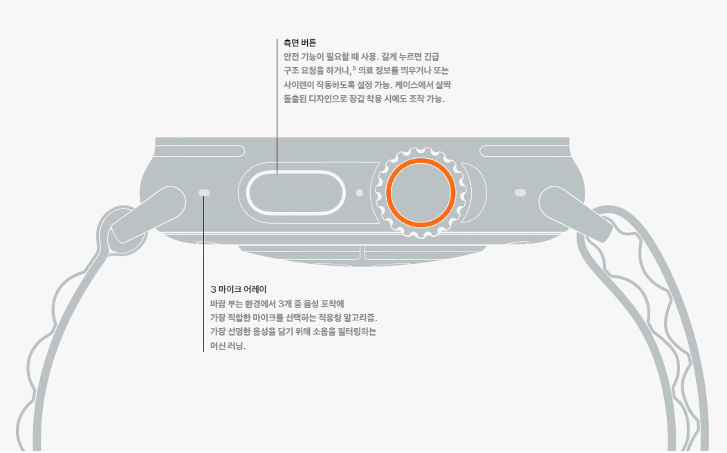 안전 기능이 필요할 때 사용. 길게 누르면 긴급 구조 요청을 하거나,5 의료 정보를 띄우거나 또는 사이렌이 작동하도록 설정 가능. 케이스에서 살짝 돌출된 디자인으로 장갑 착용 시에도 조작 가능.
