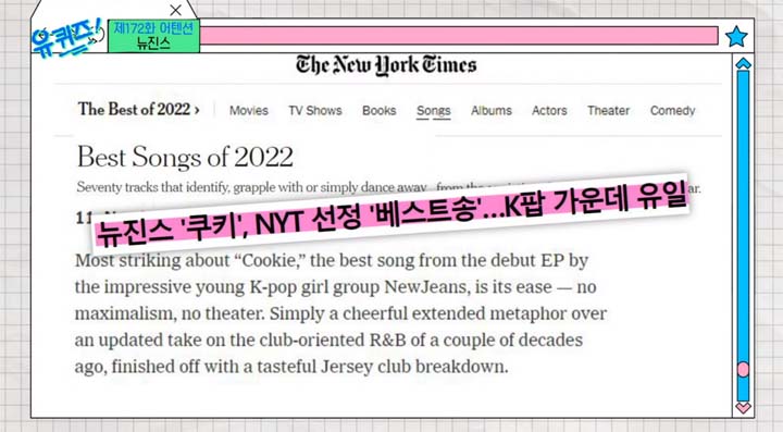● 뉴진스 쿠키 - NYT 선정 베스트 송, K팝 가운데 유일