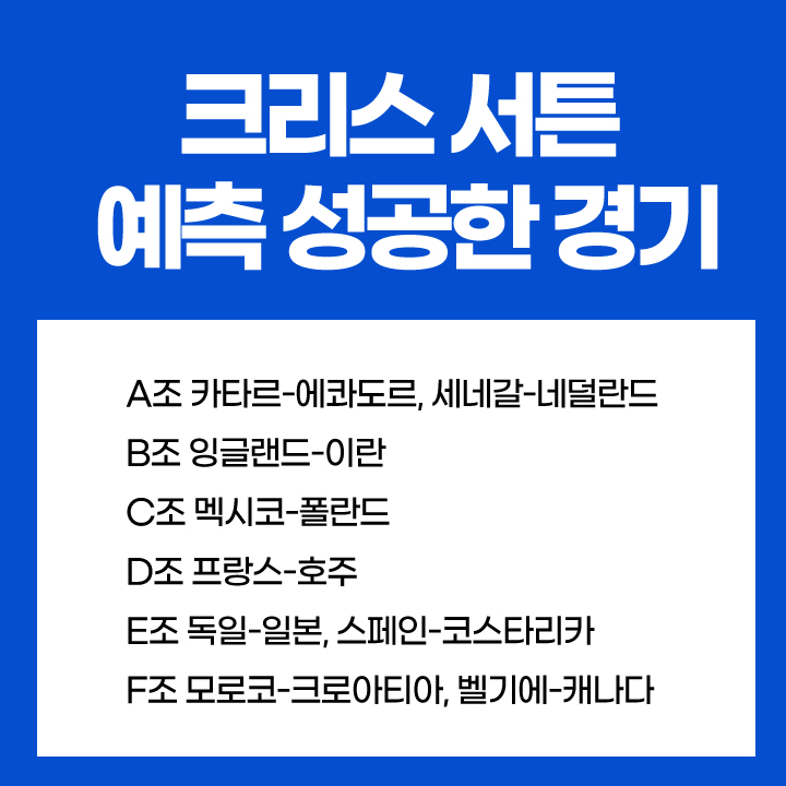 그가 맞히지 못한 경기는 미국-웨일스, 사우디-아르헨티나, 덴마크-튀니지 단 3경기 뿐이다.