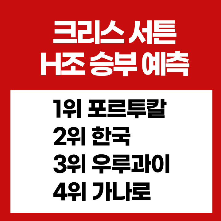 기회가 모든 팀에게 열려있는 H조는 어느 팀이 16강이 갈지 몇 번이나 마음을 바꾼 크리스 서튼은 1위 포르투칼, 2위 한국, 3위 우루과이 4위 가나로 예상했다.
