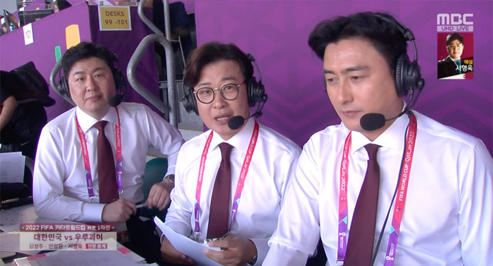 카타르월드컵 H조 대한민국, 우루과이 1차 조별리그가 월드컵 개막이후 가장 높은 시청률을 기록했다. 캐스터 김성주와 해설위원 안정환, 서형욱이 중계했던 MBC는 두 자릿수 시청률을 기록하며 많은 사랑을 받았다. 안정환은 시청자들의 마음을 대변하는 해설로 많은 사람들의 호응을 이끌어냈다.