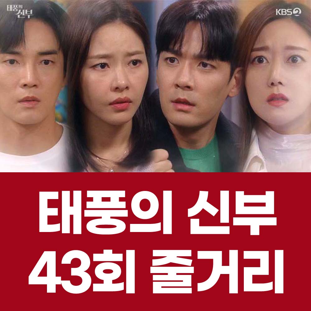 12월 15일(목) 방송된 태풍의 신부 43회에서는 윤재하(윤산들의 아버지)를 죽인 범인이 강백산임을 확신하며 은서연과 윤산들이 복수를 다짐했다.