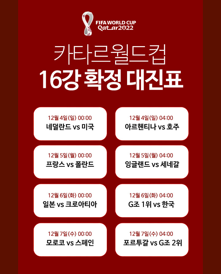 한국은 남아공월드컵 이후 12년만에 16강에 진출하게 됐다. 한국은 16강 전에서 G조 1위와 12월 6일(화) 04:00시에 경기를 치른다.