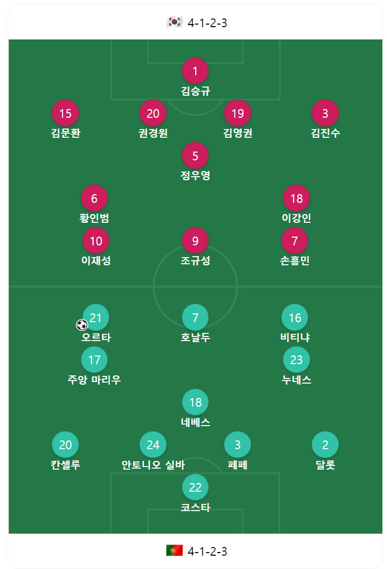 우루과이와 가나전에서 후반 교체 투입 됐던 이강인을 선발로 출전했다. 또한 한국 선수 최초 월드컵 한 경기 멀티골의 주인공 조규성도 선발 출전했다.