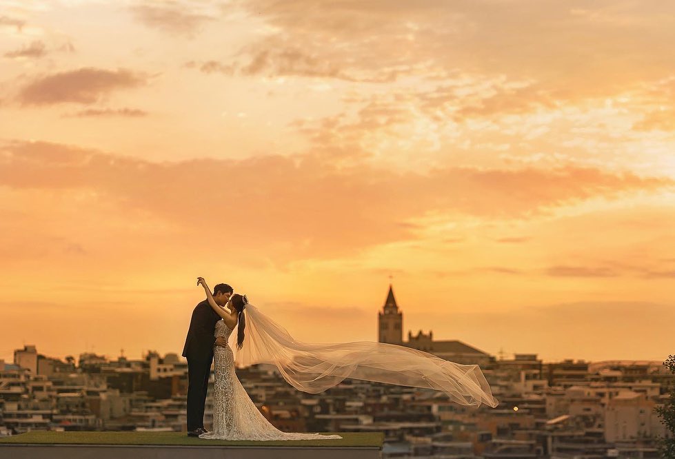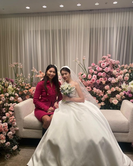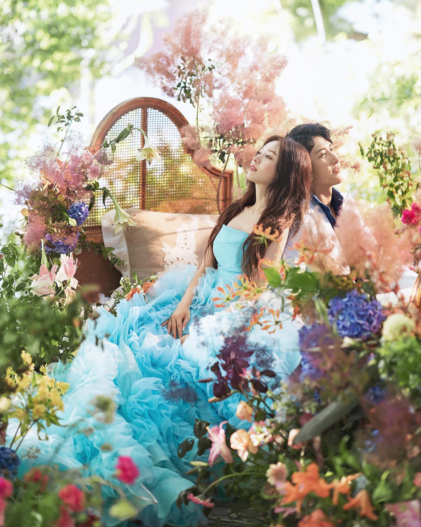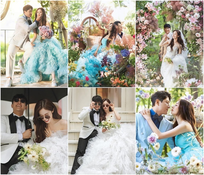 지연이 자신의 SNS에 공개한 웨딩화보에는 두 사람이 행복하게 마주보며 미소 짓고 있다.