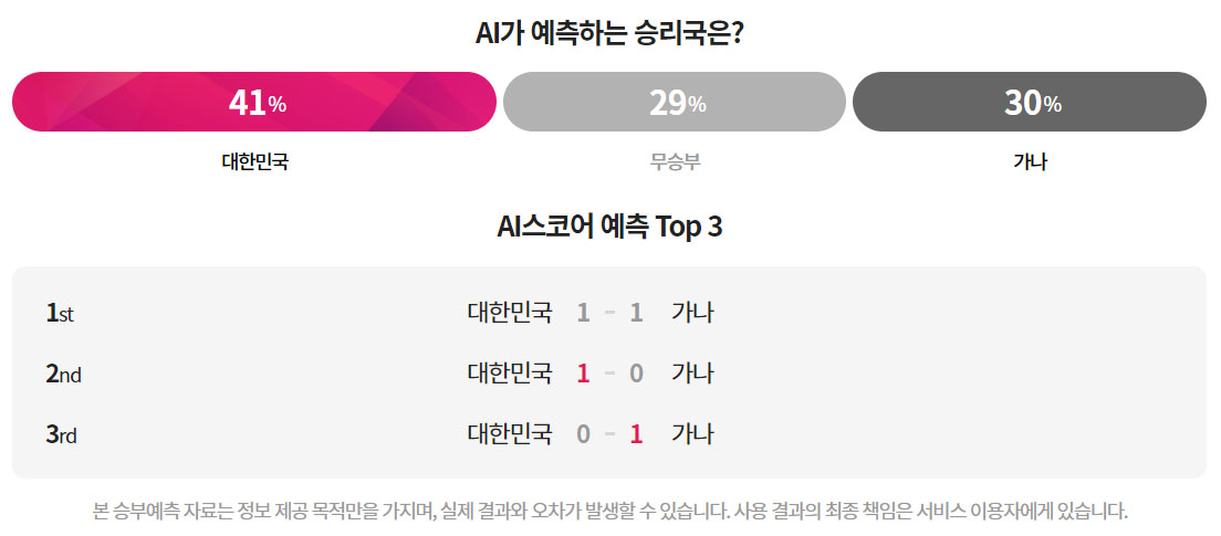 한국이 이길 가능성 40.9% / 무승부 27.8% / 가나가 이길 가능성 31.3%