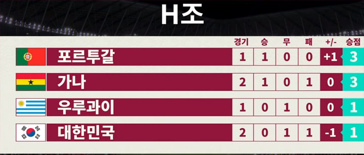 28일 가나와 조별리그 경기에서 아쉽게 패한 한국은 12월 2일(토) 0시에 H조 조별리그 3차전 포루투칼과 조별리그를 치르게 된다.