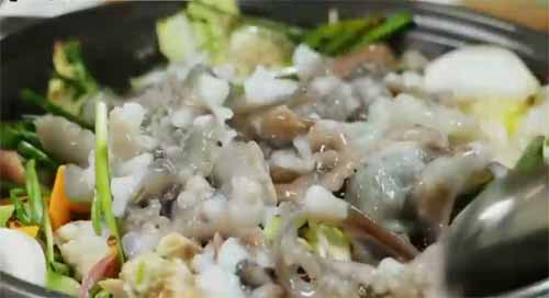 알배추, 청경채, 대파, 양파, 개조개를 넣어 살짝 익힌 뒤, 잘라둔 낙지를 투하해서 먹는 즉석 낙지볶음이다. 오래 볶지 않아 진하지 않은 양념과 조개 육수가 더해져 담백한 맛이 특징이다.