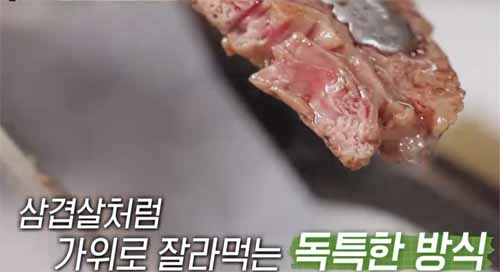 스테이크를 주문했지만 삼겹살 불판과 생고기가 등장했다. 익혀서 나오는 여느 스테이크와 달리 한지 위에 버터를 녹여 스테이크를 구워 먹는 방식이다.