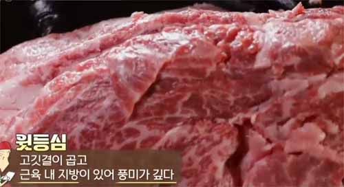 윗등심이란? 고깃결이 곱고, 근육 내 지방이 있어 풍미가 깊다. 떡심이 붙은 부위가 바로 윗등심! 윗등심은 마블링이 적은 대신 씹을수록 고기의 감칠맛이 올라온다.