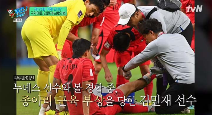 우루과이전 누녜스 선수와 볼 경합 중, 종아리 근육 부상을 당한 김민재 선수는 끝까지 무실점으로 끝내야한다는 책임감에 경기를 계속 임할 수밖에 없었다고 한다.