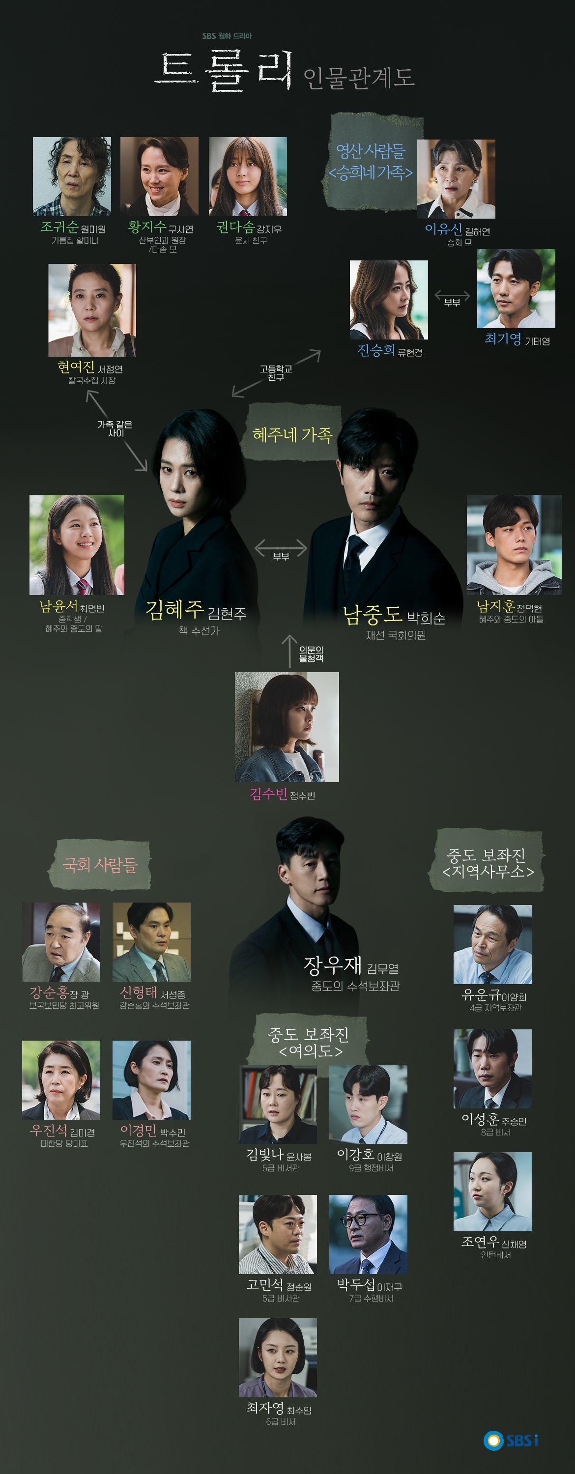 드라마 트롤리는 김혜주(김현주)와 박희순(남중도) 부부를 둘러싼 인물관계도가 형성된다.